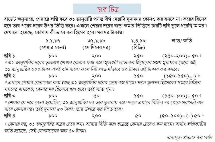 • কর হিসেব হবে ৩১ জানুয়ারি, ২০১৮-র দামকে ভিত্তি ধরে। তবে ১ এপ্রিলের পরে শেয়ার বিক্রি করলে, তবেই এই কর বসবে।