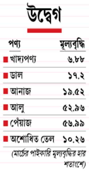 মূল্যায়ন সংস্থা ইন্ডিয়া রেটিংস অ্যান্ড রিসার্চের সিনিয়র ডিরেক্টর সুনীল কুমার সিন্হা বলেন, ‘‘খাদ্যপণ্যের মূল্যবৃদ্ধির মূল কারণ খাদ্যশস্যের মাথা তোলা দাম। ডাল এবং আনাজের মতো যে সমস্ত পণ্যের উপরে সাধারণ মানুষ নির্ভর করেন, সেগুলির দামও বেড়েছে।’’ উল্লেখ্য, মার্চে দেশের খুচরো বাজারের মূল্যবৃদ্ধির হার (৪.৮৫%) পাঁচ মাসের সর্বনিম্ন হয়েছে বটে, কিন্তু খাদ্যপণ্যের মূল্যবৃদ্ধি রয়ে গিয়েছে ৮.৫২ শতাংশে।