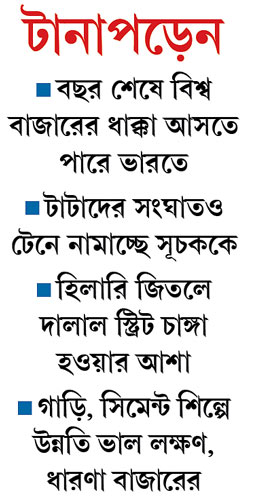এ তো গেল রাজনীতির দিক। বাজারকে ভাবাচ্ছে মার্কিন অর্থনীতিও। সে দেশের শীর্ষ ব্যাঙ্ক ফেডারেল রিজার্ভ সুদ বাড়াতে পারে, এই আশঙ্কা মাঝেমধ্যেই বাজারকে তুলছে-ফেলছে। নভেম্বরে ফেড রেট না-বাড়ায় সাময়িক স্বস্তি এলেও এটা ধীরে ধীরে স্পষ্ট হচ্ছে যে, ডিসেম্বরে কিন্তু মার্কিন মুলুকে সুদ বাড়তে চলেছে। এটা হলে আরও একটি ধাক্কা আসবে বাজারে। অর্থাৎ দেশের ভিতরে পরিস্থিতি কিছুটা সদর্থক হলেও বিদেশের পরিস্থিতি বছরের শেষ দু’মাস বাজারকে স্বস্তি দেবে না। তা ছাড়া প্রথা অনুযায়ী ডিসেম্বরের দ্বিতীয়ার্ধে বিদেশি লগ্নি সংস্থাগুলি সাধারণত বাজার থেকে হাত গুটিয়ে নেয়। অর্থাৎ আগামী দু’মাসে আশা করার মতো তেমন কিছু দেখা যাচ্ছে না। তবে ক্লিন্টন যদি মার্কিন প্রেসিডেন্ট হিসাবে নির্বাচিত হন, তা হলে অবস্থার কিছুটা হলেও উন্নতি হতে পারে।