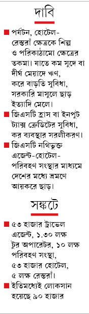 মৌখিক ভাবে পর্যটন, আতিথেয়তাকে শিল্প বলা হলেও, সরকারি খাতায় সেই তকমা নেই। অথচ শিল্পের স্বীকৃতি পেলে পুঁজি জোগানো থেকে কর, সবেতেই বাড়তি সুবিধা মেলে। পরিকাঠামো ক্ষেত্রের তকমা পেলেও তাই। পর্যটন, আতিথেয়তা ক্ষেত্রের সংগঠন এফএআইটিএইচ, এফএইচআরএ এবং আইএটিও-এর দাবিও তাই ওই দু’টিই।