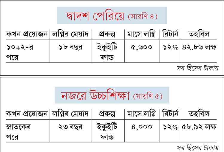 সাধারণত ১৮ বছর বয়স হল উচ্চশিক্ষায় ভর্তির সময়। তবে এ জন্যও তৈরি হতে হবে যতটা সম্ভব আগে থেকেই। এখন যদি বেসরকারি ইঞ্জিনিয়ারিং বা ডাক্তারি কলেজে পড়ার খরচ হয় ১৫ লক্ষ টাকা। তা হলে ৬% মূল্যবৃদ্ধি ধরলে ১৮ বছর পরে গিয়ে তা দাঁড়াবে প্রায় ৪৩ লক্ষে। অবিশ্বাস্য হলেও সত্যি!
