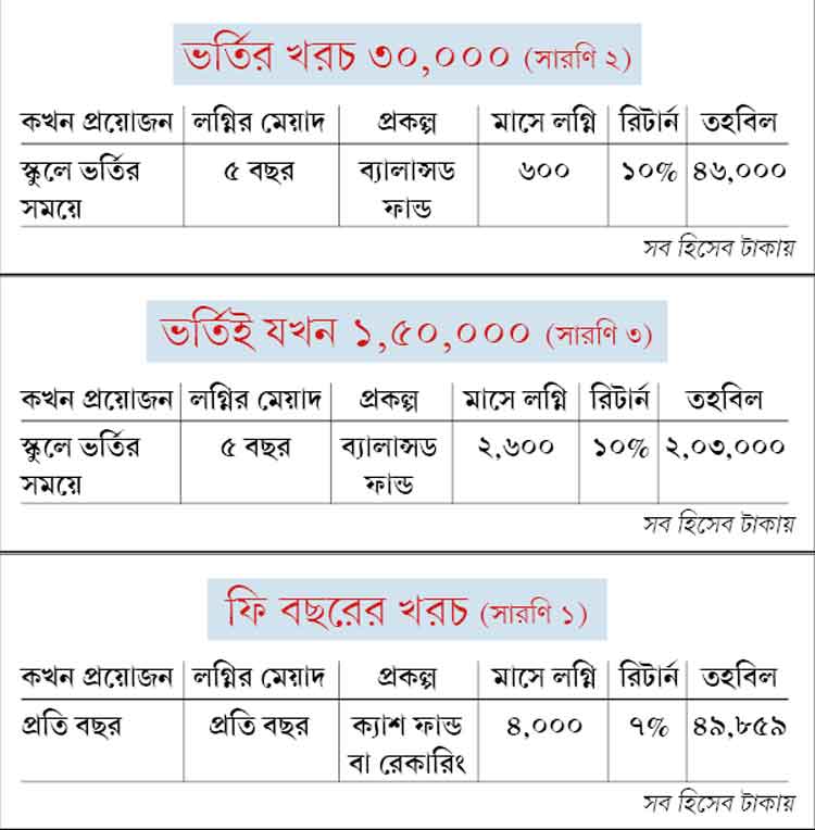 এখন যত ভাল স্কুল, খরচ তত বেশি। তাই সেই ভর্তির সময়ে যাতে চাপ না পড়ে, তার জন্য কোমর বাঁধুন। হাতে অন্তত তিন থেকে পাঁচ বছর সময় পাবেন এ জন্য। টাকা রাখতে পারেন ব্যালান্সড ফান্ডে। অথবা ঝুঁকি নিতে না চাইলে বাছতে পারেন রেকারিং, স্থায়ী আমানতকে। এখন প্রাথমিকে ভর্তির খরচ স্কুল বিশেষে ৩০,০০০ থেকে ১.৫ লক্ষ টাকা হতে পারে। ৩০ হাজারের ক্ষেত্রে পাঁচ বছর পরে মূল্যবৃদ্ধি ধরলে সেই অঙ্ক দাঁড়াবে প্রায় ৪০ হাজার টাকা। আর ১.৫ লক্ষ পৌঁছবে ২ লক্ষে। এখানে দু’টি অঙ্ক ধরেই হিসেব করছি। (সারণি ২ এবং ৩ দেখুন)।