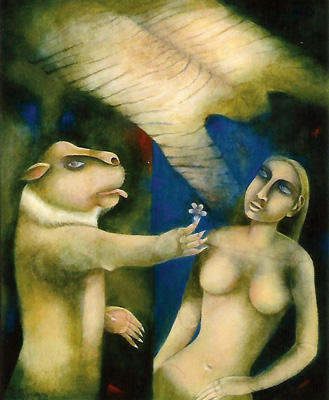 কোনও ছবিরই আলাদা কোনও শিরোনাম নেই। সবই ‘বাঘ-আবেগ’-এর অন্তর্গত। তেমনই একটি ছবিতে দেখা যাচ্ছে এক নগ্নিকা নারী দাঁড়িয়ে আছে। তার সামনে একটি বাঘ। সেও দু-পায়ে ভর করে দাঁড়ানো। ডান হাতে একটি ফুল সে বাড়িয়ে ধরেছে ওই মানবীর দিকে। তাদের মাথার উপরে একটি বাঘের চামড়া ছড়ানো রয়েছে। প্রেমের স্পর্শে সমস্ত হিংস্রতা যেন মানবিক হয়ে উঠেছে। আর একটি ছবিতে অল্প জ্যোৎস্নালোকিত রাতে বনের ভিতর একটি গাছ মানবীর রূপ ধারণ করেছে। তার সামনে দাঁড়িয়ে একটি বাঘ হাসিমুখে তাকে অভিবাদন করছে। আকাশে রয়েছে এক টুকরো বাঁকা চাঁদ। দুটি ছবিতে কল্পরূপের ধরন দু’রকম। ঐতিহ্যগত আঙ্গিককেই শিল্পী দু’রকম কল্পরূপে বিশ্লেষিত করেছেন। কাগজের উপর করা জলরং-ভিত্তিক কিছু মিশ্রমাধ্যমের ছবিতে রূপের এই ভাঙন বা বিশ্লেষণের মধ্যে তিনি নতুন মাত্রা সঞ্চারিত করতে পেরেছেন। সে রকম একটি ছবিতে দেখা যাচ্ছে রাত্রিবেলা বনের ভিতর গাছের তলায় একটি বাঘ শুয়ে আছে। হাঁ-করা মুখে জিভ বের করে গাছের সঙ্গেই সে যেন সংলাপে মগ্ন। ছবিটিতে বর্ণের বিন্দু-মাত্রিক বিচ্ছুরণে বুনোটের যে বিশেষ ধরন তৈরি হয়েছে, ছবিটির সামগ্রিক ভাবনায় তা এক বিশেষ মাত্রা যোগ করেছে। এ ধরনের ছবিতেই শিল্পী তাঁর আঙ্গিকের স্বতন্ত্র অভিমুখ তৈরি করতে পেরেছেন, নব্য-ভারতীয় ঘরানার প্রসারণ হয়েও যা আধুনিকতাবাদী বৈশিষ্ট্যে উজ্জ্বল। রেখা-ভিত্তিক অনেক ছবিতেও শিল্পী অবয়বের সঙ্গে সামগ্রিক পরিসরের এবং সেই পরিসরের ভিতর বিভিন্ন জ্যামিতিক ক্ষেত্রের সমন্বয় ও সংঘাতকে কল্পনাদীপ্ত ভাবে উপস্থাপিত করেছেন।