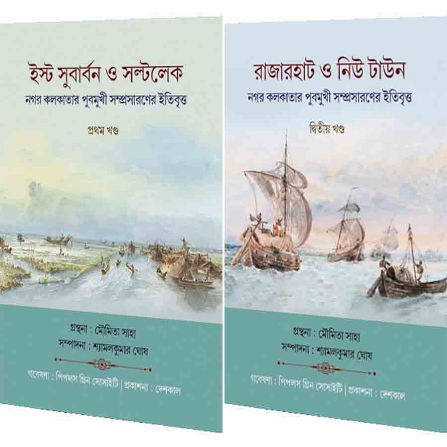 কলকাতার পূর্ব প্রান্তের বিস্তীর্ণ জলাভূমি বুজিয়ে দুই অত্যাধুনিক উপনগরী গড়ে ওঠার ইতিহাস নিয়ে বহু সরকারি ও বেসরকারি রিপোর্ট অনুসন্ধানের চেষ্টা করেছে পিপল’স গ্রিন সোসাইটি। এই বিপুল তথ্যভান্ডার বিশ্লেষণ করে উপনগরী দু’টির ভূগোল-ইতিহাস রচনা সহজ নয়। বই দু’টি পড়তে বসে গ্রন্থনা ও সম্পাদনার দক্ষতার অভাব পাঠকে কিছুটা বিভ্রান্ত করবে। সূচনায় একটি পরিচ্ছেদে সময়ের পারম্পর্য অনুসারে ঘটনাগুলি সাজিয়ে দিলে পাঠকদের বুঝতে সুবিধা হত, বিশেষত আমার মতো অলস কিন্তু উন্মুখ পাঠকের। তবু এ কথা অনস্বীকার্য, দুই দশক ধরে সংগ্রহ করা নানা রিপোর্ট, কিছু বিরল ছবি এবং মানচিত্র দুই মলাটের মধ্যে বেঁধে দিয়ে দেশকাল প্রকাশনা একটি জরুরি কাজ করল। এই তথ্যভান্ডার আগামী দিনে নবীন গবেষকদের তথ্য অনুসন্ধানের পরিশ্রম কিছুটা লাঘব করবে।