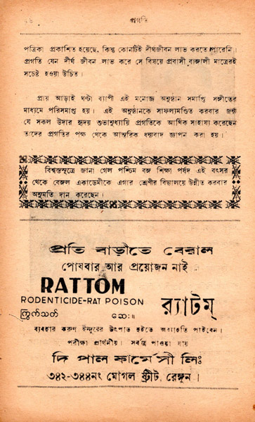 পত্রিকায় অজস্র বিজ্ঞাপন, সমাজতাত্ত্বিকদের গবেষণার বিষয় হতে পারে। ‘নিউ মাতৃ ভাণ্ডার’ বা ‘নির্মল প্রিন্টিং ওয়ার্কস’ এর বাংলা বিজ্ঞাপন বর্মা মুলুকে বাঙালির আধিপত্য প্রকাশ করছে নিঃসন্দেহে। কিন্তু চমকে যেতে হয় এমন বিজ্ঞাপনে: “প্রতি বাড়ীতে বেরাল পোষবার আর প্রয়োজন নাই।” আসলে এটি এক ধরনের ইঁদুরের বিষের প্রচার। আবার কোনও এক থানডং টি-এস্টেট বিজ্ঞাপনে লিখছে, “আমার নাম চা, আমার পেশা পরোপকার।” শুধু মায়ানমারের বাঙালির রাজনৈতিক সঙ্কট চেনার জন্যই নয়, তাঁদের আর্থ-সামাজিক জীবন বোঝার জন্যও এই বইটি পড়ার প্রয়োজন আছে।