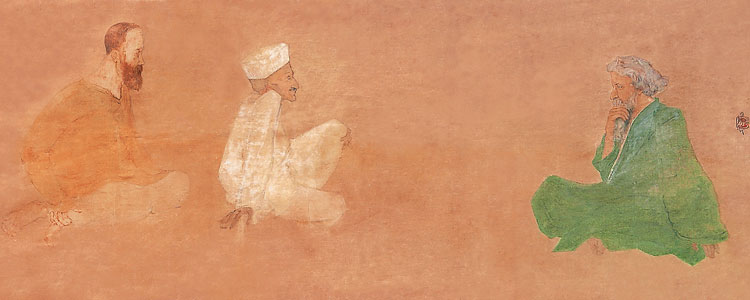ত্রয়ী: জোড়াসাঁকোয় দীনবন্ধু অ্যান্ডরুজ়, মহাত্মা গাঁধী ও রবীন্দ্রনাথ। শিল্পী: অবনীন্দ্রনাথ ঠাকুর। পেন্টিংস অব অবনীন্দ্রনাথ টেগোর (সম্পা: আর শিবকুমার, প্রতিক্ষণ) বই থেকে