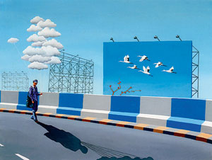 নির্জন হাইওয়ে। হেঁটে যাচ্ছে শুধু একলা একজন। হাতে তাঁর সুতোয় বাঁধা মেঘেরা উড়ছে। পথের পাশে বড় হোর্ডিং-এ উড়ন্ত এক আকাশ বকের সারি। প্রকৃতির পায়ে আজ মানুষ কিভাবে শিকল পড়াচ্ছে, তারই এক ছবি এঁকেছেন তরুণ শিল্পী প্রসেনজিৎ দাস। শিল্পীর প্রথম একক অনুষ্ঠিত হল অ্যাকাডেমিতে। স্বাভাবিকতাকে কল্পরূপে রূপান্তরিত করে তিনি সভ্যতার ভ্রষ্টতাকে উন্মোচিত করেছেন। অত্যন্ত সম্ভাবনাময় এই শিল্পী।
