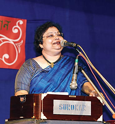 • সম্প্রতি এশিয়াটিক সোসাইটির বিদ্যাসাগর মঞ্চে কবি ও নাট্যকার দ্বিজেন্দ্রলাল রায়ের গান শোনালেন নীলা মজুমদার। শিল্পীর পরিবেশিত দশটি গানের মধ্যে কোনওটি ভারতীয় রাগ-রাগিণী আধারিত, কোনওটি পাশ্চাত্য সঙ্গীতের আদলে। কীর্তনাঙ্গের গান ‘ওকে গান গেয়ে গেয়ে’ বা মুক্ত ছন্দের গান ‘তোমারেই ভালবেসেছি’ শিল্পীর কণ্ঠে অন্য মাত্রা পায়। তবে অবশ্যই উল্লেখ করতে হয় রাগ-রাগিণী আধারিত ‘বরষা আইল ওই ঘনঘোর মেঘে’ গানটির কথা।