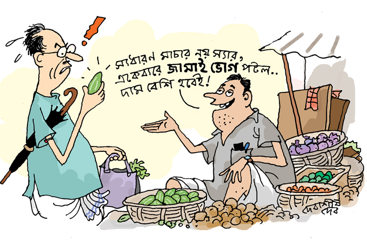 জামাইষষ্ঠীর আগুন বাজারে দরাদরি চলে না। অলঙ্করণ: দেবাশীষ দেব
