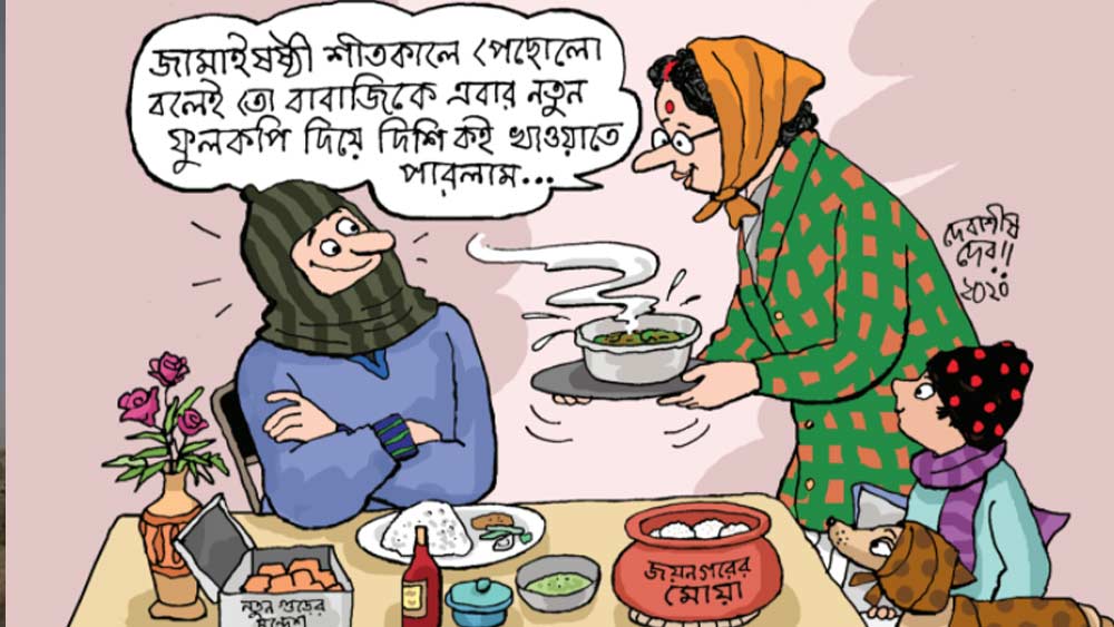 আশা করি, আগামী কয়েক মাসের মধ্যে আমাদের চারপাশের পরিবেশটা অনেকটাই সুস্থ ও স্বাভাবিক হয়ে উঠবে। প্রাণের ছন্দ ফিরে পাবে জগৎ-সংসার। তখন না হয় আমরা এই পার্বণটিকে বিশেষ ভাবে পালন করব। হতে পারে সেটা দুর্গাপুজোর পর, হতে পারে সেটা শীতকালে, হতে পারে সেটা আগামী বসন্তকালে পলাশ উৎসবের সময়। এ-ও হতে পারে, তখন হিমসাগর আমের বদলে লেকমার্কেটে কাশ্মীরি আপেল উঠবে, ইলিশের বদলে কাঁসার পদ্মকাটা বাটিতে সাজানো থাকবে নবীন ফুলকপি দিয়ে দিশি কই, রসগোল্লার বদলে জেল্লা দেখাবে পেস্তা ছড়ানো জয়নগরের মোয়া আর পাড়ার বাতাস ভুরভুর করবে নতুনগুড় দিয়ে বানানো আতপচালের পায়েসের সুগন্ধে। জামাই ষষ্ঠীতে সেটা বরং একটু নতুনত্বও হবে, মুখবদলও হবে। জামাইবাবাজি পাঞ্জাবির সঙ্গে হয়তো পাবে কাঁথাস্টিচের সুন্দর জহরকোট। কিছু কিছু ডেঁপো শালা-শালী আড়াল থেকে, ‘শীতকালে এটা জামাই ষষ্ঠী না শীতল ষষ্ঠী রে ভাই!’ বলে যতই হাসাহাসি করুক না কেন, সবার কথা ভুলে গিয়ে স্বার্থপরের মতো এ বারে কিছুতেই নিজেদের বাড়ির জামাই ষষ্ঠীটা আমরা যথাসময়ে পালন করে ফেলতে পারব না। তখনই পালন করব, যখন আমাদের চারপাশের নানান স্তরের মানুষগুলো আর্থিক ও সামাজিক ভাবে কিছুটা অন্তত সামলে উঠবেন। তবেই তো আমরা মন থেকে এর আনন্দটা ঠিকঠাক উপভোগ করতে পারব।