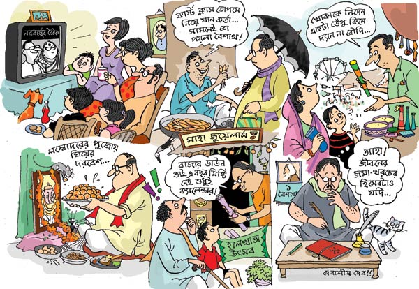 তখন পয়লা বৈশাখের একাদশী-পূর্ণিমা দাগানো বাংলা ক্যালেন্ডারে যে সমস্ত ছবি ছাপা হত তার মধ্যে ঠাকুর শ্রীশ্রীরামকৃষ্ণদেবের বুকের ভেতরে মা-কালীর মুখচ্ছবি, জানলার ধারে ধূসররঙা জোব্বা পরে সদ্য লিখতে বসা রবীন্দ্রনাথ, তেজোদীপ্ত চোখ নিয়ে নেতাজি, নজরুলের সাইডফেস কিংবা নিজের মহিমায় উদ্ভাসিত গণেশ অথবা বিষ্ণু অবতার। দেবদেবীর মুখচ্ছবি মনের মতো হলে তার ‘প্রমোশন’ ছিল অবশ্যম্ভাবী। মানে, বছর ফুরোলেই নীচের মাসগুলিকে ছেঁটে ফেলে, বাঁধাইয়ের দোকানে নিয়ে গিয়ে তাঁদের ফ্রেম-বন্দি করে সোজা ঠাকুরঘরের দেওয়ালে ঝুলিয়ে দেওয়া হত। ফি বেস্পতিবার তাঁদের গলায় জুটত ভেজা গাঁদা বা জবার মালা। মনে পড়ে এক বছর পয়লা বৈশাখে পাজামা-পাঞ্জাবির সঙ্গে আমার একটি শুঁড়তোলা টুকটুকে নাগরা হয়েছে। দু'দিন ধরে সেখানা বাড়িতে পরে ঘুরে ঘুরে দু’পায়ের দু’জায়গায় টুলটুলে ফোস্কা। তাই সে বার একটি হাতরিকশায় চড়ে আমি জ্যাঠাদের সঙ্গে দোকানে দোকানে গিয়ে নববর্ষের নিমন্ত্রণ রক্ষা করেছিলাম। নাগরার কদর এবং দোকানের আদর— কোনওটাই তাঁরা শেষ পর্যন্ত বাতিল করে দিতে চাননি।