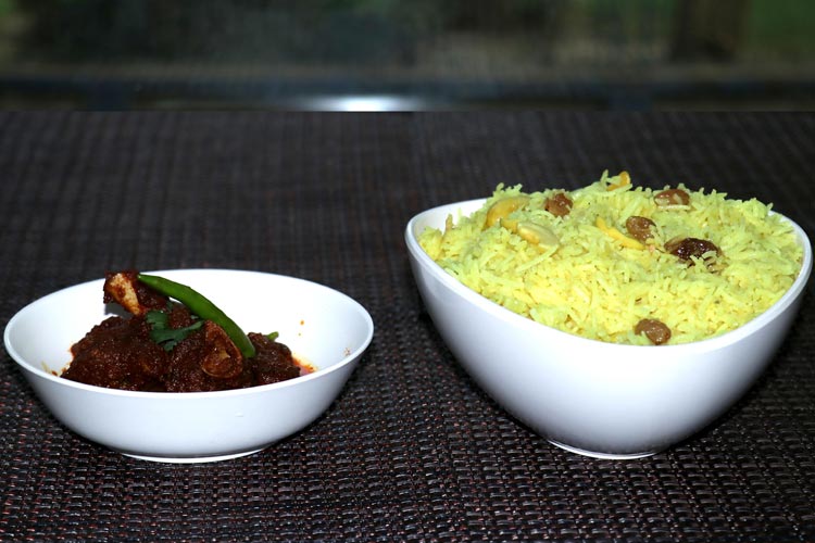 টোম্যাটো, লঙ্কা গুঁড়ো, হলুদ, গোটা গরম মশলা, পেঁয়াজ, রসুন দিয়ে মাটন সিদ্ধ করে রাখুন। কাজু, টোম্যাটো, আদা, রসুন বাটা ও চারমগজ দিয়ে গ্রেভি বানিয়ে রাখুন। এ বার প্যানে ঘি-তে তেজপাতা, গোটা গরম মশলা ও শুকনো লঙ্কা ফোড়ন দিন। এ বার সিদ্ধ মাংস দিয়ে নেড়ে নিয়ে গ্রেভি ঢেলে দিন। শেষে নুন দিয়ে নামিয়ে পোলাও এর সঙ্গে গরমা গরম পরিবেশন করুন। সিদ্ধ বাসমতীতে জাফরান দেওয়া দুধ ঢেলে রাখুন। প্যানে ঘি দিয়ে গরম মশলা ফোড়ন দিন। সুগন্ধ বেরোলে ভাত ঢেলে দিন। নুন চিনি দিন। কাজু ও কিসমিস ছড়িয়ে পরিবেশন করুন।