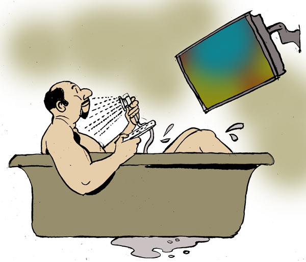 বাঙালির সংস্কৃতির দিক থেকে শ্রেষ্ঠ জাত, আবার পেটের অসুখের দিক থেকেও। প্রায়ই সিরিয়ালের মাঝামাঝি আপনার পেট চনচন করে ওঠে। সন্ধে সাড়ে ছ’টা থেকে রাত্তির এগারোটা অবধি একটু শান্তিতে সিরিয়াল দেখে সংস্কৃতিচর্চা করবেন, সে স্কোপটুকুও আপনাকে দেয় না এই পোড়া পেট। অথচ কোনও শিক্ষিত বাঙালি তো আর সিরিয়াল না দেখে থাকতে পারে না, তা হলে তার ঐতিহ্য ও সাধনা চুরচুর হয়ে ভেঙে পড়বে, পঁচিশে বৈশাখ রবীন্দ্রজয়ন্তী ও অন্য তিনশোচৌষট্টি দিন তদ্গত সিরিয়াল-গেলন তার পবিত্র কর্তব্য। এ দিকে, প্রতি বার অ্যাড-ব্রেক হলে তবেই পাঁইপাঁই ছুটব, আবার ব্রেক শেষের আগেই প্রকৃতির কারবার শেষ করে শোঁ বেরিয়ে আসব, এ অলিম্পিক তো সম্ভব নয়। তাই বাথরুমে টিভি লাগান, যাতে সারস্বত সাধনায় কোনও ছেদ না পড়ে, একটা সিনও ননদের কাছ থেকে না শুনে নিতে হয় (সে চক্রান্ত করে আপনাকে ভুল ইনফর্মেশনও দিতে পারে, হয়তো নায়কের দ্বিতীয় বিয়েটা চেপে গেল!), কমোডে বসে তোফা দেখতে থাকুন লাইন দিয়ে দাঁড়িয়ে বউমাকে অত্যাচার। চান করার সময় জল লেগে টিভি নষ্ট হলে, ফের একটা টিভি ফিট করুন। কালচারের ব্যাপারে বাঙালির কোনও কালচে আপোস নেই!
