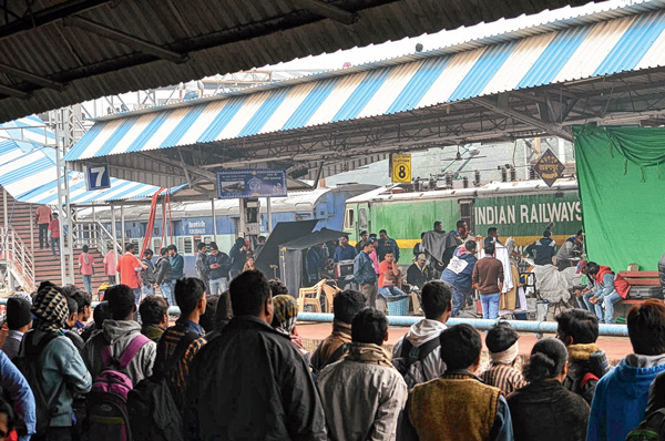 খড়্গপুর স্টেশনে শ্যুটিং দেখতে ভিড়। ছবি: সৌমেশ্বর মণ্ডল।
