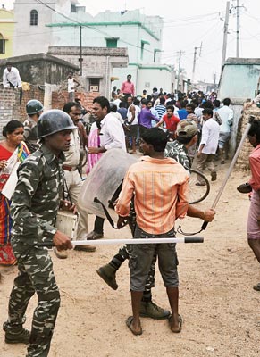 উত্তেজিত জনতাকে লাঠিচার্জ করে সরিয়ে পরিস্থিতি নিয়ন্ত্রণে আনে পুলিশ ও কমব্যাট ফোর্স। ছবি: অভিজিৎ সিংহ