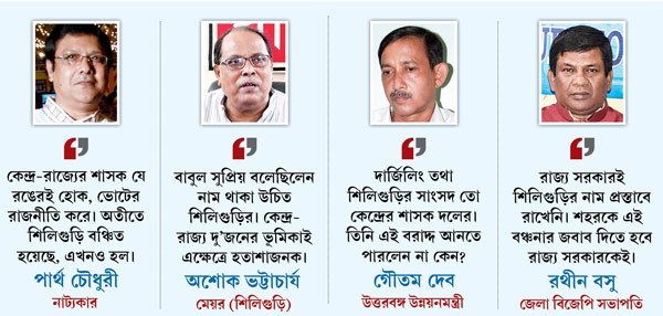 জেলা কংগ্রেস সভাপতি তথা বিধায়ক শঙ্কর মালাকার বলেন, ‘‘বিজেপি সরকার তো বটেই এটা রাজ্যের ব্যর্থতা। শিলিগুড়ি তো বটেই আবার উত্তরবঙ্গকে বঞ্চিত করা হল।’’ বাম শরিকদের অন্যতম আরএসপি’র জেলা সম্পাদক বিনয় চক্রবর্তী বলেন, ‘‘শিলিগুড়ির অবমাননা করা হল। এলাকায় সাংসদ বিজেপি’র। তিনি কি করলেন তাই তো বুঝতে পারলাম না। আধুনিক নগরান্নয়নের একটি প্রকল্প থেকে শহর বঞ্চিত হল।’’