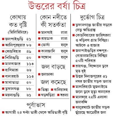 বৃষ্টির সঙ্গে পাল্লা দিয়ে বাড়ছে নদীর জল। রবিবার ভোরে গঙ্গারামপুরের জাহাঙ্গিরপুর অঞ্চলের রামদেবপুরে মাটির দেওয়াল চাপা পড়ে আব্দুল রহমান মিয়াঁ (৫৬) ও জুলেখা বিবি (৫০) নামে এক দম্পতির মৃত্যু হয়েছে। বালুরঘাট শহরের সঙ্গে হিলি, তপন, কুশমন্ডি এবং গঙ্গারামপুর ব্লকের একাংশ প্লাবিত হয়ে পরিস্থিতি ঘোরালো হয়ে উঠেছে।