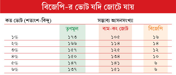 লোকসভা ভোটের হিসেবকে বিধানসভার আসনে ভাগ করলে দেখা যাচ্ছে, রাজ্যের চারটি রাজনৈতিক শক্তি— তৃণমূল কংগ্রেস, বামফ্রন্ট, কংগ্রেস এবং বিজেপি-র ঝুলিতে ভোট যাবে যথাক্রমে ৩৯.৮, ২৯.৯, ৯.৭ এবং ১৬.৮ শতাংশ। আসনসংখ্যা দাঁড়াবে যথাক্রমে ২১৪, ২৮, ২৮ এবং ২৪। বামফ্রন্ট আর কংগ্রেসের জোট হলে প্রাপ্ত ভোটের হার অপরিবর্তিত রেখে যদি এই দুই দলের ভোট যোগ করে দেওয়া হয়, তবে তাদের সম্মিলিত ভোটের ভাগ দাঁড়াবে ৩৯.৬ শতাংশ, এবং আসনসংখ্যা দাঁড়াবে ৯৭। সে ক্ষেত্রে, তৃণমূল কংগ্রেস ও বিজেপি-র ভোটের ভাগ অপরিবর্তিত থাকলেও আসন কমে দাঁড়াবে যথাক্রমে ১৭৯ এবং ১৮। অর্থাৎ, জোট হলে বামফ্রন্ট ও কংগ্রেস, উভয় দলের আসনসংখ্যাই বাড়লেও তাতে তৃণমূল কংগ্রেসের দুশ্চিন্তার কোনও কারণ থাকছে না।