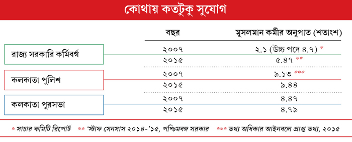 সাচার রিপোর্ট থেকে জানা যায়, পশ্চিমবঙ্গে সরকারি উচ্চপদে মুসলমানদের অংশগ্রহণ মাত্র ৪.৭ শতাংশ, এবং মোট সরকারি চাকরিতে মাত্র ২.১ শতাংশ। রাজ্য সরকারের ব্যুরো অব ইকনমিক ও স্ট্যাটিস্টিকস প্রশাসনিক কাজের সঙ্গে যুক্ত সরকারি কর্মচারীদের বিষয়ে নানা খুঁটিনাটি তথ্যের উপর ভিত্তি করে ‘স্টাফ সেন্সাস’ তৈরি করে। বিগত দু’বছর ধরে পশ্চিমবঙ্গ সরকারি কর্মচারীদের মধ্যে মুসলমানদের প্রতিনিধিত্বের হিসাব এতে পাওয়া যাচ্ছে। দেখা যাচ্ছে, রাজ্য সরকারের মোট সাড়ে তিন লক্ষের কিছু বেশি কর্মচারীর মধ্যে মাত্র ৫.৪৭ শতাংশ মুসলমান। গত দশ বছরে, সরকারি চাকরিতে মুসলমানদের অংশগ্রহণের শ্লথ গতির কাছে কচ্ছপও হার মানবে। এই গতিতে এগোলে, খুবই সহজ পাটিগণিতের হিসাবে, জনসংখ্যার নিরিখে মুসলমানদের প্রতিনিধিত্ব সমতা-গুণাঙ্কে পৌঁছতে অন্তত ৬০ বছরেও বেশি সময় লাগবে। প্রসঙ্গত, ‘স্টাফ সেন্সাস’ থেকে জানা যায়, সরকারি কর্মচারীদের মধ্যে সামগ্রিক ভাবে মাত্র ২০ শতাংশ মহিলা যুক্ত। সরকারি কাজে মুসলমান মহিলাদের অংশগ্রহণ একেবারেই নগণ্য।