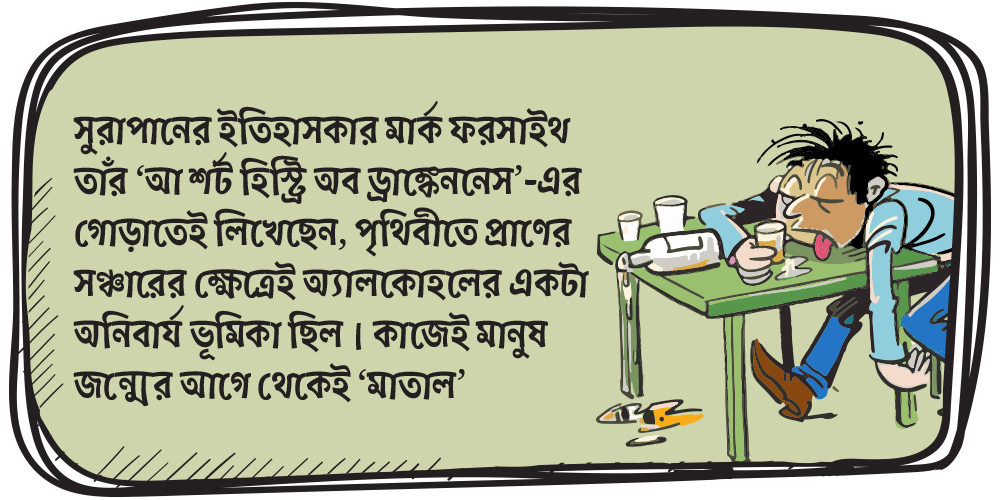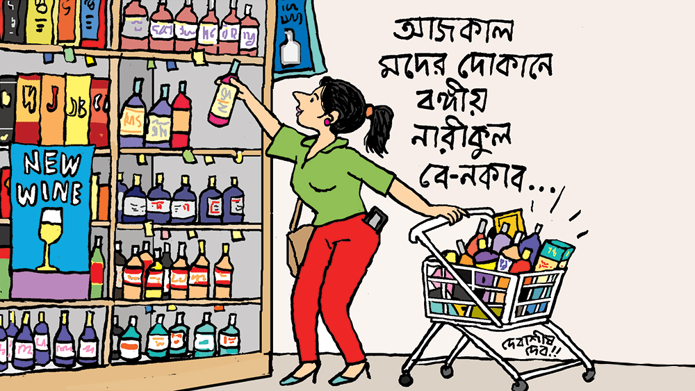 দেশে স্বদেশি হাওয়া বইতে থাকলে ‘মদ খাওয়া বড় দায়’ হয়ে দাঁড়ায়। মদের দোকানের সামনে পিকেটিং একটা ‘অগ্রবর্তী কাজ’ বলে গণ্য হতে শুরু করে। স্বাধীনতার পরেও এই হাওয়া বজায় ছিল। তারাপদ রায়ের মদ ও মাতাল সম্পর্কিত বিভিন্ন রম্যরচনা ঘেঁটে জানা যায়, মদ্যপায়ীরা এক সময়ে পাড়ায় পাড়ায় চিহ্নিত থাকতেন। তাঁদের সবাই যে নিন্দিত ছিলেন, এমন নয়। শরৎচন্দ্রের ‘দেবদাস’ মাতালদের এক প্রকার গৌরবান্বিতই করে রেখেছিল দীর্ঘকাল। পাড়ার মাতাল পরিচিত হতেন ‘ব্যর্থ প্রেমিক’ হিসেবে। প্রেম ও মদ তখন বাইনারি অপোজিশনে খেলা করত। বারে বসে নারী-পুরুষে একত্র পানাহার বাঙালি মধ্যবিত্তের জীবনে সুলভ ছিল না। মোটামুটি ১৯৮০-র দশক পর্যন্ত এই হাওয়া বজায় ছিল। কিন্তু বিশ্বায়ন-উত্তর পর্বে এই দৃষ্টিভঙ্গি টোটালি ঘাপলা হয়ে যায়। মদ একেবারে খুল্লমখুল্লা ধারায় বাঙালি জীবনে নেমে আসে। গত দশ বছরে যে হারে মদের অন ও অফ শপ এ রাজ্যে ডানা মেলেছে, তা দেখলে হুতোমও ভিরমি খেতেন। এই পরিস্থিতিতে ‘কুলীন’ মাতালরা যেমন তাঁদের মহিমা হারান, তেমনই পেঁচি মাতালরা সমাজে ‘ওপেন’ হয়ে পড়েন। বড় বড় শপিং চেন চালু হলে চাল-ডাল-তেল-নুন মাসকাবারির পাশে হুইস্কি-ভদকা-রাম-ওয়াইনও লভ্য হয়। মদ তার গ্ল্যামার হারায়। সানফ্লাওয়ার তেলের পলি-বোতলের পাশে উঁকি মারতে শুরু করে ওল্ড মঙ্ক রামের বোতল। নামজাদা ডিপার্টমেন্টাল স্টোরগুলোয় মদের আলাদা বিপণিতে লিঙ্গভেদ দূর হয়, মদ যে একান্ত ভাবে পুরুষভোগ্য— এই ধারণা বিলীন হয়। বঙ্গীয় নারীকুল বেনকাব হয়ে মদের দোকানে খদ্দের হয়ে দাঁড়িয়ে পড়েন।