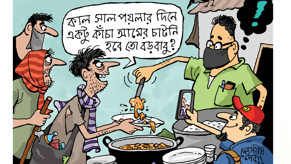 চৈত্র সংক্রান্তির দিন তিনেক আগে পাড়ার এক বয়স্ক ব্যারিস্টার, যিনি দুর্গাপুজো কমিটির গত ন’বছরের প্রেসিডেন্ট এবং ‘ব্যারিস্টারজেঠু’ নামেই বেশি পরিচিত, পাড়ার সেই সোশ্যাল মিডিয়া গ্রুপে জানিয়েছিলেন, পয়লা বৈশাখের দিন উনি পংক্তিভোজনের সমস্ত অতিথিকে নিজের খরচে একপিস করে পাকাপোনার কালিয়া আর একটি করে ভাল মিষ্টি খাওয়াতে চান। বছরের প্রথম দিন, অতিথিদের এইটুকু খাতির না করলে কি চলে! শুনে পাড়ার ক্লাবের সেক্রেটারি আর সেই ক্যাটারারের মালিকের তো প্রায় বিষম খাওয়ার জোগাড়। খেতে আসা মানুষের হিসেব যা দাঁড়িয়েছে তাতে প্রথম দিন সত্তর জন থেকে শুরু করে দ্বিতীয় দিন একশো বারো জন এবং তৃতীয় দিন থেকে অ্যাভারেজ দুশো কুড়ি থেকে আড়াইশোর মধ্যে দাঁড়াচ্ছে। এমনিতেই এখন বাজারে মাছের বেশ আকাল। একসঙ্গে এতগুলো মাছ কিনে কাটিয়ে নিয়ে এসে ভেজেকষে কালিয়া রান্না করা একটা বাড়তি সময়ের ব্যাপার।