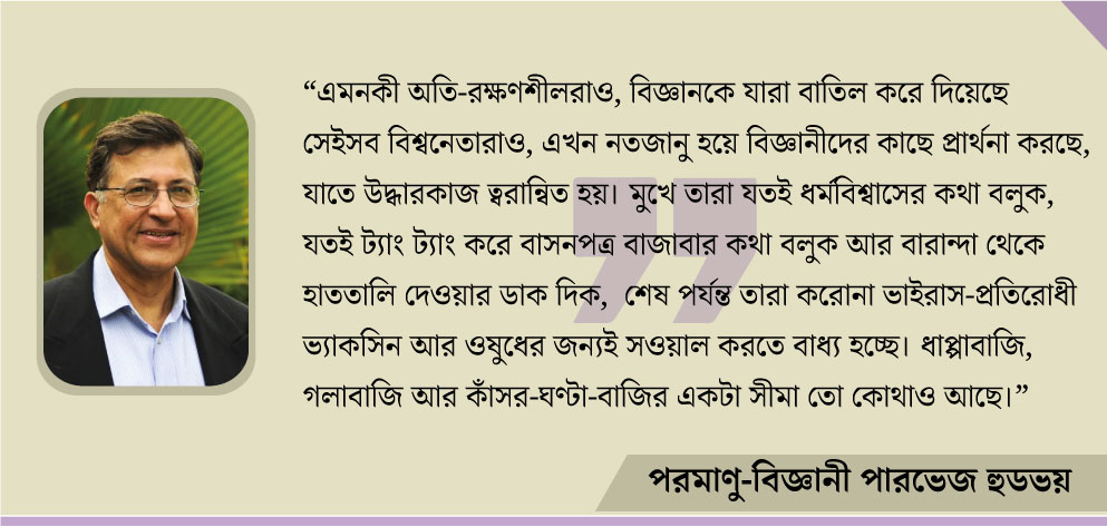 তাহলে কী দাঁড়াল? কিরীটি সমস্যার সমাধান করা তো দূরের কথা, যেসব প্রতিষ্ঠান ওই ভাইরাসের বংশবিস্তারে বিশেষ সাহায্য করেছে তাদের অন্যতম হল ধর্ম। এ জিনিসে আমাদের কী প্রয়োজন? আচার্য আবদুস সালামের প্রিয় ছাত্র, পাকিস্তানের বিখ্যাত পরমাণু-বিজ্ঞানী পারভেজ হুডভয় চমৎকার লিখেছেন, ‘‘এমনকি অতি-রক্ষণশীলরাও, বিজ্ঞানকে যারা বাতিল করে দিয়েছে সেইসব বিশ্বনেতারাও, এখন নতজানু হয়ে বিজ্ঞানীদের কাছে প্রার্থনা করছে, যাতে উদ্ধারকাজ ত্বরান্বিত হয়। মুখে তারা যতই ধর্মবিশ্বাসের কথা বলুক, যতই ট্যাং ট্যাং করে বাসনপত্র বাজাবার কথা বলুক আর বারান্দা থেকে হাততালি দেওয়ার ডাক দিক, শেষ পর্যন্ত তারা করোনা ভাইরাস-প্রতিরোধী ভ্যাকসিন আর ওষুধের জন্যই সওয়াল করতে বাধ্য হচ্ছে। ধাপ্পাবাজি, গলাবাজি আর কাঁসর-ঘণ্টা-বাজির একটা সীমা তো কোথাও আছে।’’