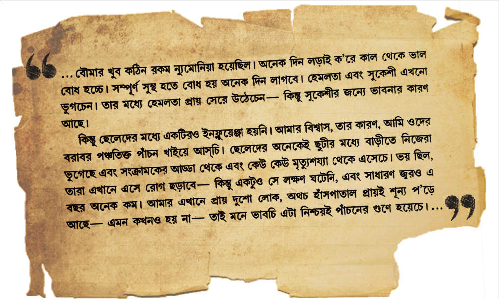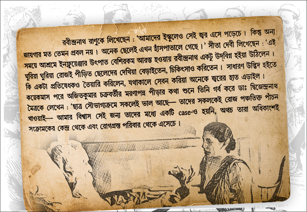১৯১৯-এর ১ জানুয়ারি বন্ধু জগদীশচন্দ্র বসুকে সে সময়ের ইনফ্লুয়েঞ্জার কথা উল্লেখ করে চিঠি লিখছেন রবীন্দ্রনাথ। তিনি লিখছেন, ‘আমার এখানে প্রায় দুশো লোক, অথচ হাঁসপাতাল প্রায়ই শূন্য প’ড়ে আছে— এমন কখনও হয় না— তাই মনে ভাবচি এটা নিশ্চয়ই পাঁচনের গুণে হয়েচে।’ ছাত্রদের নিয়ে খানিক নিশ্চিত হলেও তিনি পরিবারের মানুষদের নিয়ে চিন্তিত ছিলেন। চিঠিতে যেমন লিখছেন,'বউমার খুব কঠিন রকম ন্যুমোনিয়া হয়েছিল। অনেক দিন লড়াই করে কাল থেকে ভাল বোধ হচ্ছে। সম্পূর্ণ সুস্থ হতে বোধ হয় অনেক দিন লাগবে। হেমলতা এবং সুকেশী এখনো ভুগচেন। তার মধ্যে হেমলতা প্রায় সেরে উঠেচেন— কিন্তু সুকেশীর জন্য ভাবনার কারণ আছে। কিন্তু ছেলেদের মধ্যে একটিরও ইনফ্লুয়েঞ্জা হয়নি। আমার বিশ্বাস, তার কারণ, আমি ওদের বরাবর পঞ্চতিক্ত পাঁচন খাইয়ে আস্চি।"