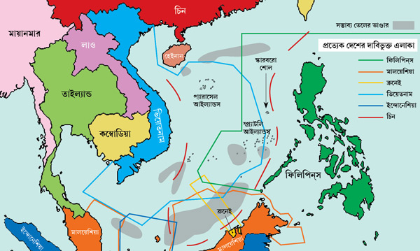 দক্ষিণ চিন সাগর জুড়ে ছড়িয়ে থাকা ছোট ছোট দ্বীপ, প্রবাল প্রাচীর, বালির চরকে লাগোয়া দেশগুলির নিজের দখলে আনার লড়াই কিন্তু বেশ পুরনো। কারণ, এই অঞ্চলের অবস্থান আর প্রাকৃতিক সম্পদ। এখানে খনিজ তেল আর প্রাকৃতিক গ্যাসের এক বিরাট ভাণ্ডার রয়েছে বলে অনুমান, যেখানে এখনও মানুষের হাত পৌঁছয়নি। আবার, প্রাকৃতিক সম্পদের প্রাচুর্য আর বাণিজ্যিক প্রয়োজনে মাছ ধরার জন্য ফিলিপিন্স, মালয়েশিয়া এবং দক্ষিণ ভিয়েতনাম-লাগোয়া স্প্র্যাটলি দ্বীপপুঞ্জ চমৎকার জায়গা। তা ছাড়া, পাঁচ ট্রিলিয়ন (লক্ষ কোটি) ডলারের বিশ্ব-বাণিজ্য যাতায়াত করে এই পথ দিয়ে। এমন জায়গাকে নিজের তাঁবে আনার লোভ সামলানো মুশকিল। ফলে দেশগুলোও কিছু কিছু অঞ্চল নিজের বলে দাবি করেছে এবং সেখানে যে যার মতো করে অর্থনৈতিক কাজকর্ম চালাতে চেয়েছে। সমস্যা, চিন এ যাবৎ অন্য দেশের দাবিকে উড়িয়ে তাদের কাজে অনবরতই বাগড়া দেওয়ার চেষ্টা করছে। এই দড়ি টানাটানি থামাতেই চিন, ব্রুনেই, মালয়েশিয়া, ফিলিপিন্স এবং ভিয়েতনাম বছর পাঁচেক আগে একগুচ্ছ নির্দেশিকা তৈরি করেছিল। কিন্তু এতে সামুদ্রিক পরিবেশের সুরক্ষা, বৈ়জ্ঞানিক গবেষণা, জাহাজ চলাচলের সুরক্ষার মতো বেশ কিছু গুরুত্বপূর্ণ বিষয় থাকলেও তেল এবং গ্যাস নিয়ে কোনও স্পষ্ট নীতি নেওয়া হয়নি। ফলে, অশান্তিও কমেনি।