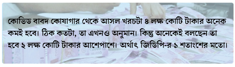 অর্থাৎ যদি ধরেও নিই যে অর্থনীতি ফিরে এল নিজের ছন্দে এবং সরকারের আয়ের কোনও ক্ষতিই হল না, তা হলে এই ৪.২ লক্ষ কোটি টাকাই হবে কোভিড খাতে খরচ। কিন্তু তা তো হওয়ার নয়! কারণ উৎপাদন তলানিতে। তাই আয় কমবে। এবং কোভিড বাবদ কোষাগার থেকে আসল খরচটা ৪ লক্ষ কোটি টাকার অনেক কমই হবে। ঠিক কতটা, তা এখনও অনুমান। কিন্তু অনেকেই বলছেন তা হবে ২ লক্ষ কোটি টাকার আশেপাশে। অর্থাৎ জিডিপি-র ১ শতাংশের মতো।