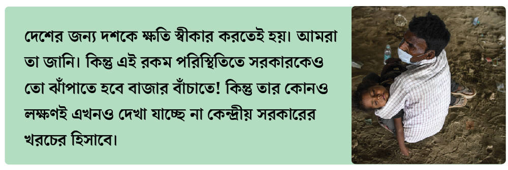 দেশের জন্য দশকে ক্ষতি স্বীকার করতেই হয়। আমরা তা জানি। কিন্তু এই রকম পরিস্থিতিতে সরকারকেও তো ঝাঁপাতে হবে বাজার বাঁচাতে! কিন্তু তার কোনও লক্ষণই এখনও দেখা যাচ্ছে না কেন্দ্রীয় সরকারের খরচের হিসাবে। ওই ২০ লক্ষ কোটি টাকার অঙ্কটা মিলতেই চাইছে না। বাজারে চাহিদা বাড়াতে হলে সরকারের খরচ বাড়াতে হবে। কারণ বাজারে সরকারই সব থেকে বড় ক্রেতা। কিন্তু এখনও পর্যন্ত সরকারের কোষাগারের অঙ্কে তো তা পাওয়া যাচ্ছে না!