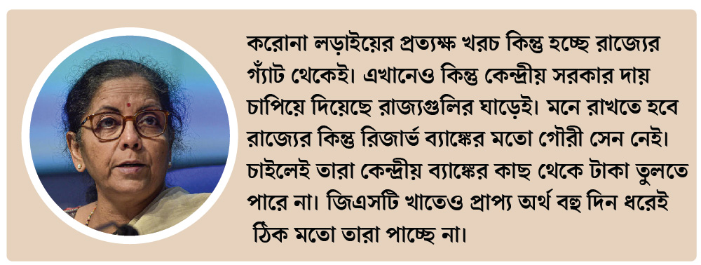 আসি রাজ্য প্রসঙ্গে। এই মুহূর্তে প্রধান সমস্যা হল নাগরিকের স্বাস্থ্য এবং পেটের ভাত। করোনা লড়াইয়ের প্রত্যক্ষ খরচ কিন্তু হচ্ছে রাজ্যের গ্যাঁট থেকেই। এখানেও কিন্তু কেন্দ্রীয় সরকার দায় চাপিয়ে দিয়েছে রাজ্যগুলির ঘাড়েই। মনে রাখতে হবে রাজ্যের কিন্তু রিজার্ভ ব্যাঙ্কের মতো গৌরী সেন নেই। চাইলেই তারা কেন্দ্রীয় ব্যাঙ্কের কাছ থেকে টাকা তুলতে পারে না। জিএসটি খাতেও প্রাপ্য অর্থ বহু দিন ধরেই ঠিক মতো তারা পাচ্ছে না। এপ্রিলের হিসাবেই দেখা যাচ্ছে— রাজ্যগুলির জিএসটি বাবদ ৩০ হাজার থেকে ৩৪ হাজার কোটি টাকা পাওনা থেকে গিয়েছে ডিসেম্বর-জানুয়ারির প্রাপ্য খাতে। তার মধ্যে কিছু টাকা কেন্দ্রীয় সরকার ছেড়েছে, কিন্তু বাকি রয়ে গিয়েছে একটা বড় অংশই।