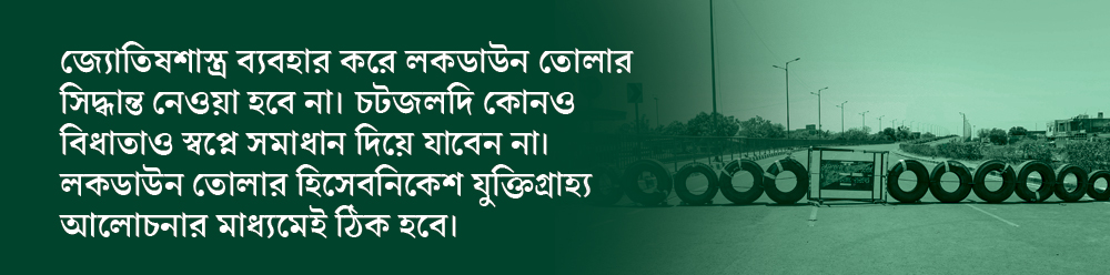 আমরা সকলেই বুঝি (অনেক সময় রাজনীতির দায়ে মুখে অন্য কথা বলি) বিশ্ব এখন পুরোপুরি বিজ্ঞান এবং প্রযুক্তির ওপর নির্ভরশীল। ফলে জ্যোতিষশাস্ত্র ব্যবহার করে লকডাউন তোলার সিদ্ধান্ত নেওয়া হবে না। চটজলদি কোনও বিধাতাও স্বপ্নে সমাধান দিয়ে যাবেন না। অর্থাৎ লকডাউন তোলার হিসেবনিকেশ যুক্তিগ্রাহ্য আলোচনার মাধ্যমেই ঠিক হবে।