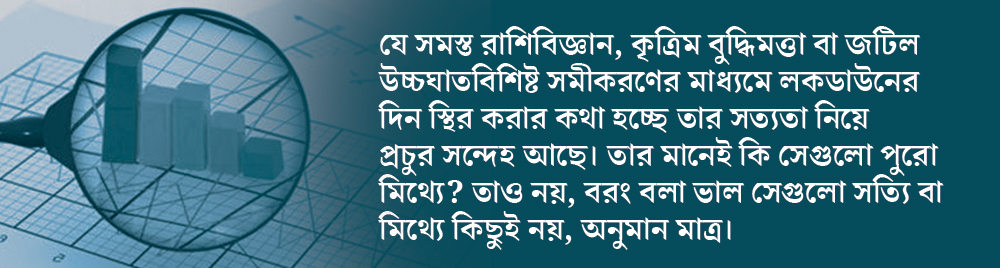 এ বার প্রশ্ন উঠবে এই সমস্ত অনুসিদ্ধান্তে আমরা আসছি কী ভাবে? সবটাই কি তথ্য ঘেঁটে, নাকি গোটা পরিস্থিতি বিচার করে অনুমানের মাধ্যমে? সোজা বাংলায় বলতে গেলে গোটাটাই অনুমান। তা হলে এত যে লেখচিত্র ভেসে বেড়াচ্ছে চারদিকে তার কি কোনও মূল্য নেই? মূল্য আছে শুধু এর মধ্যে জোগাড় হওয়া ডেটার, যদি তা ঠিক থাকে। কিন্তু তার উপর ভিত্তি করে যে সমস্ত রাশিবিজ্ঞান, কৃত্রিম বুদ্ধিমত্তা বা জটিল উচ্চঘাতবিশিষ্ট সমীকরণের মাধ্যমে লকডাউনের দিন স্থির করার কথা হচ্ছে তার সত্যতা নিয়ে প্রচুর সন্দেহ আছে। তার মানেই কি সেগুলো পুরো মিথ্যে? তাও নয়, বরং বলা ভাল সেগুলো সত্যি বা মিথ্যে কিছুই নয়, অনুমান মাত্র। অর্থাৎ তার কিছু মিলবে, আর কিছু মিলবে না, কিছু হয়ত আংশিক মিলবে। আর এই মেলা না মেলার মধ্যে কোনও কৃতিত্ব বা অসাফল্য নেই। এই অসম্পূর্ণতা একেবারেই বিজ্ঞানের অংশ।