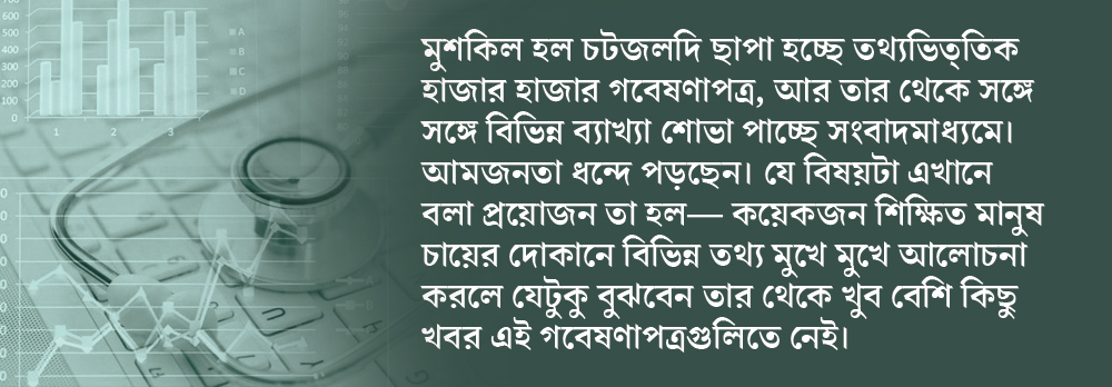 মুশকিল হল চটজলদি ছাপা হচ্ছে তথ্যভিত্তিক হাজার হাজার গবেষণাপত্র, আর তার থেকে সঙ্গে সঙ্গে বিভিন্ন ব্যাখ্যা শোভা পাচ্ছে সংবাদমাধ্যমে। আমজনতা ধন্দে পড়ছেন। যে বিষয়টা এখানে বলা প্রয়োজন তা হল— কয়েকজন শিক্ষিত মানুষ চায়ের দোকানে বিভিন্ন তথ্য মুখে মুখে আলোচনা করলে যেটুকু বুঝবেন তার থেকে খুব বেশি কিছু খবর এই গবেষণাপত্রগুলিতে নেই।
