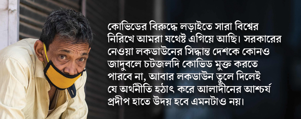 অর্থাৎ সাময়িক লকডাউন উঠে যাওয়াটা এই মুহূর্তে একেবারেই হাঁটু ঝাঁকানো প্রতিক্রিয়ায় কিছু সিদ্ধান্ত। করোনাকে স্বাভাবিক ধরে নিলে গোটা সমাজব্যবস্থা বদলাতে হবে, আর কোভিড-১৯ বিদায় নিলেও বছরখানেকের আগে পরিস্থিতি স্বাভাবিক হওয়া শক্ত।