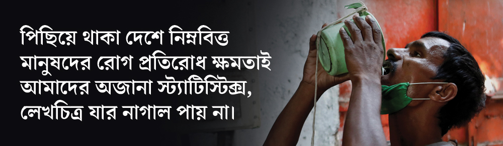 সবশেষে বলতেই হয়— লকডাউন আমাদের দেশে বিপুল ভাবে সংক্রমণ না ছড়ানোর একটা বড় কারণ। যতই লকডাউন ভাঙার খবর আসুক না কেন, তা এক-একটি এলাকার মধ্যেই। সংক্রমণের ব্যাপ্তি তাই লকডাউনে নিয়ন্ত্রিত। বনগাঁ, কৃষ্ণনগর, বর্ধমান এই সব জায়গা থেকে যদি নিয়মিত ট্রেন চলাচল শুরু হয়ে যায় এখনই এবং কলকাতা শহরের মধ্যে আবার যাতায়াত করে ভিড় বাস, তা হলে সংক্রমণ যে হইহই করে বাড়বে সেটা বোঝার জন্যে বিদেশের আকাশপাতা থেকে লেখচিত্র ধার নেওয়ার প্রয়োজন নেই। শত সমালোচনা সত্ত্বেও ভারতবাসী হিসেবে আমাদের নজর থাকুক সরকারের সিদ্ধান্ত এবং ঘোষণার দিকে। কোভিডের বিরুদ্ধে লড়াইতে সারা বিশ্বের নিরিখে আমরা যথেষ্ট এগিয়ে আছি। সরকারের নেওয়া লকডাউনের সিদ্ধান্ত দেশকে কোনও জাদুবলে চটজলদি কোভিড মুক্ত করতে পারবে না, আবার লকডাউন তুলে দিলেই যে অর্থনীতি হঠাৎ করে আলাদীনের আশ্চর্য প্রদীপ হাতে উদয় হবে এমনটাও নয়। তবু এর মধ্যে একটুকরো রোদের ফালি— আমাদের দেশে সংক্রমণের সংখ্যা এখনও নিয়ন্ত্রণে থাকা। সেই তালিকায় ধারাভির বস্তিও আছে। পিছিয়ে থাকা দেশে নিম্নবিত্ত মানুষদের রোগ প্রতিরোধ ক্ষমতাই আমাদের অজানা স্ট্যাটিস্টিক্স, লেখচিত্র যার নাগাল পায় না।