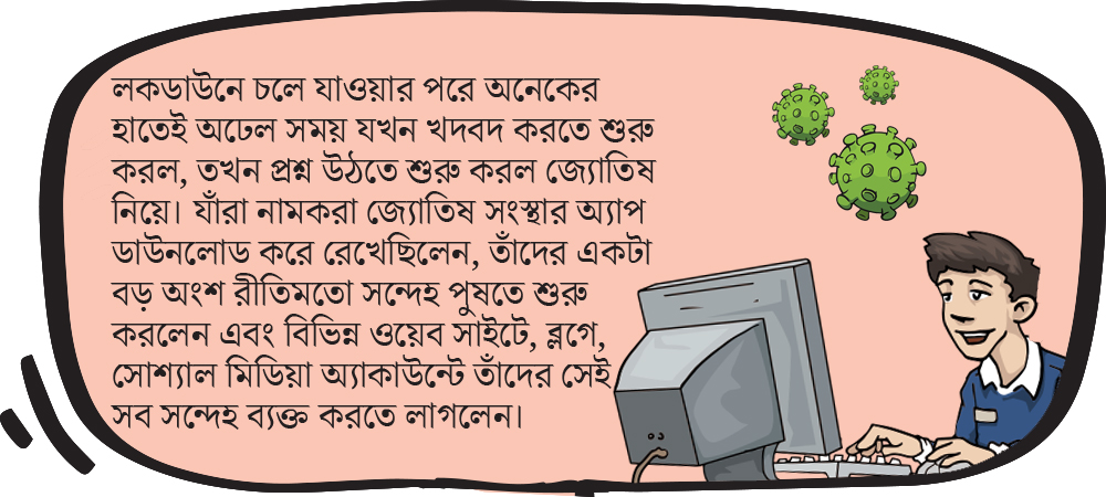 বিভিন্ন জ্যোতিষ সাইটে, অ্যাপে জনগণের ভবিষ্যৎ সম্পর্কে যে সব কথা বলা হয়েছিল, একে একে সেগুলোকে তুলে ধরে শুরু হল তুলোধোনা। অতিমারি, লকডাউন এবং তার ফলে বিশ্ব অর্থনীতির বিপর্যয় এবং তার সূত্রেই মানুষের জীবিকায় টানাপড়েন— এই নিয়ে কোন চেতাবনি দিয়েছিলেন ভবিষ্য-কথকরা, এই মর্মে ক্ষোভের উদ্গীরণ শুরু হয় সর্বত্র। ২০২০-এর মার্চ মাস থেকে আর ব্যক্তিগত নয়, বিশ্বসুদ্ধ পাবলিকের ভাগ্য এক অর্থে ‘নৈর্ব্যক্তিক হয়ে উঠল। ঘরবন্দি, উদ্বেগে দীর্ণ এই দশা সম্পর্কে জ্যোতিষীদের কী চেতাবনি ছিল— এই প্রশ্ন রাগী কণ্ঠস্বরে উঠে আসতে শুরু করল। যাঁরা বিশ্বাস হারিয়েছেন, তাঁরা এবং যাঁরা এখনও বিশ্বাস হারাননি তাঁরাও একই রকম আর্তি নিয়ে জ্যোতিষীদের প্রশ্ন করে চললেন (এখনও অনেকে করে চলেছেন)— কবে এই গেরো কাটবে?