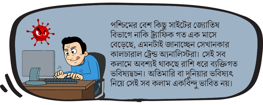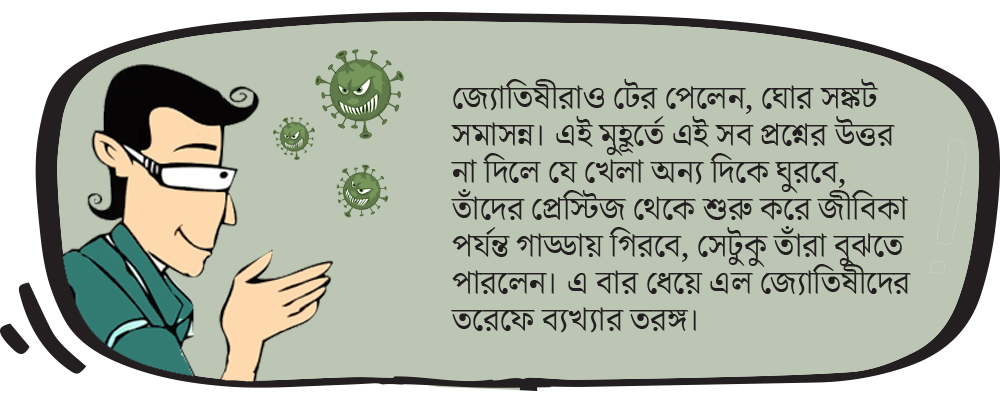 বিপদ যখন ঘনিয়ে ঘাড়ের উপর ঝাঁপিয়ে পড়ে, যখন বিপদ্গ্রস্তের ঘাড়টি মট করে ভেঙে যাওয়ার দশা হয়, তখনই চার পাশ থেকে নিদান হাঁকাহাঁকি আরম্ভ হয়— আগেই বলেছিলাম বাপু, সাবধান হও। হওনি, এখন ঠেলা সামলাও। করোনাভাইরাস সংক্রান্ত বিশ্ববিপর্যয়ের পরে জ্যোতিষ চর্চার বিষয়টা নিয়ে ভাবতে বসলে এমনটাই মনে হচ্ছে। যেখানে তিল তিল চুলচেরা বিশ্লেষণ করে বিংশোত্তরী নাকি ধুত্তেরি মতে মানুষের ভবিষ্যতের নাড়িভুঁড়ি বের করা ফেলা হয়ে থাকে, সেখানে এমন একটা মারাত্মক বিপদের আশঙ্কা টের পেলেন না জ্যোতিষীঠাকুররা? উলটে ২০২০-এর গোড়ায় ইন্টারনেট জুড়ে জ্যোতিষ সাইটগুলো ঘোষণা করেছিল— এটা নাকি একটা দুর্দান্ত বছর, অর্থনৈতিক প্রগতি, মানবিক অগ্রগতি, সামাজিক গতিজাড্য—সব নাকি একেবারে পটকার মতো ফাটবে। কিন্তু ফেব্রুয়ারি গত হতে না হতেই সব ফুউউউস্। কেউ এর কোনও কথাই বলেন না। বিশ্ব জোড়া জ্যোতিষ সভায় নিরবচ্ছিন্ন নীরবতা পালনের ঢল নেমেছে। এক্ষণে বিশ্ব জুড়ে একটা প্রশ্ন জ্বলজ্বল করছে, করোনা সংক্রমণে কি জ্যোতিষের দিন ফুরলো? আবিশ্ব মানুষ কি আস্থা হারালেন জ্যোতিষে?