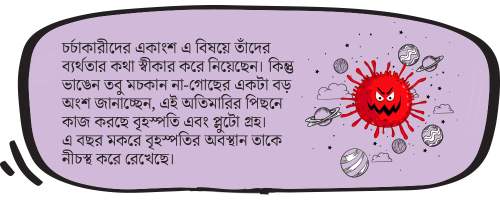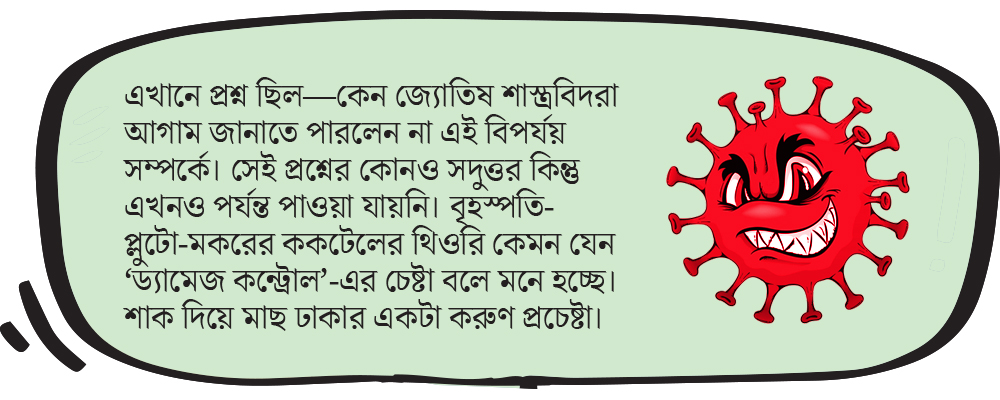 প্রথমেই জ্যোতিষ বিশেষজ্ঞরা বলে রাখেন, ব্যক্তিমানুষের ভাগ্য বিচার আর দেশ-পৃথিবীর ভবিষ্যৎ নির্ণয় এক কাজ নয়। দেশ-পৃথিবী নিয়ে চর্চা করে পাশ্চাত্য ‘মান্ডেন অ্যাস্ট্রোলজি’। সেটা নাকি ব্যক্তিমানুষের ক্ষেত্রে প্রযোজ্য নয়। তা এই মান্ডেন অ্যাস্ট্রোলজির চর্চাকারীরা কি সামান্যতম আঁচটুকু পেলেন না এ হেন বিপর্যয়ের? চর্চাকারীদের একাংশ এ বিষয়ে তাঁদের ব্যর্থতার কথা স্বীকার করে নিয়েছেন। কিন্তু ভাঙেন তবু মচকান না-গোছের একটা বড় অংশ জানাচ্ছেন, এই অতিমারির পিছনে কাজ করছে বৃহস্পতি এবং প্লুটো গ্রহ। এ বছর মকরে বৃহস্পতির অবস্থান তাকে নীচস্থ করে রেখেছে। ফলে বৃহস্পতি নাকি তার কাছ থেকে অভিপ্রেত শুভফল দিতে পারছে না। পাশ্চাত্য জ্যোতিষে আবার এই উচ্চ-নীচ ব্যাপারটা নাকি নেই। তা হলে ঘাপলা হি ঘাপলা! থাক বেস্পতি। প্লুটো মশায়ের খতিয়ান নেওয়া যাক। সৌরমণ্ডলের বৃহত্তম গ্রহের সঙ্গে এই খুদে গ্রহটিও নাকি মকর রাশিতে অবস্থান করছে। সে কারণেই নাকি এই ধামাল। তা হলে দোষ বেস্পতিরও নয়, প্লুটোরও নয়। দোষ মকরের। এর পরের যুক্তিটা সাংঘাতিক। পশ্চিমী জ্যোতিষে মকর নাকি ‘বৃদ্ধ’-দের রাশি। মকর-জাতকরা নাকি সকলেই অকাল-বার্ধক্যের শিকার হন। এই কারণে করোনার আক্রমণ বৃদ্ধদের ক্ষেত্রেই কালান্তক হয়ে দাঁড়াচ্ছে।