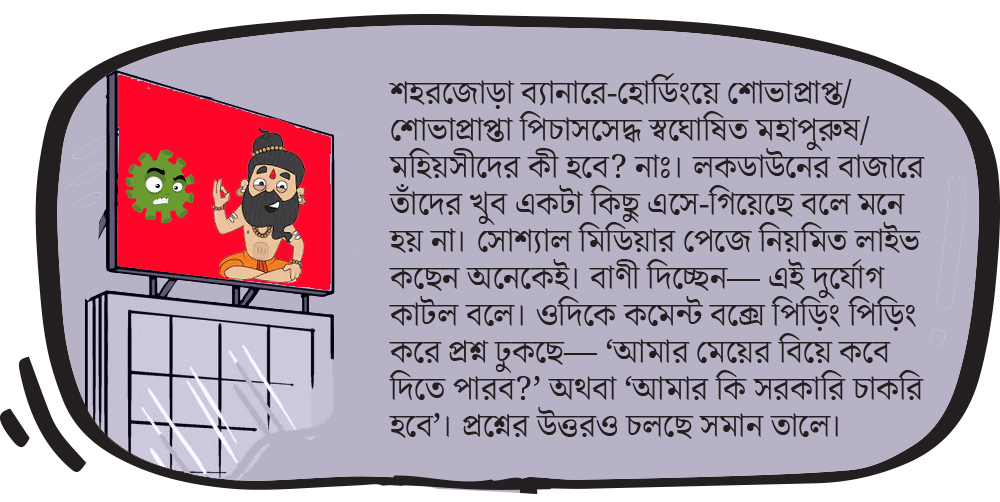 মান্ডেন থেকে সরে আসি আমাদের জমিতে। শহরজোড়া ব্যানারে-হোর্ডিংয়ে শোভাপ্রাপ্ত/ শোভাপ্রাপ্তা পিচাসসেদ্ধ স্বঘোষিত মহাপুরুষ/ মহিয়সীদের কী হবে? নাঃ। লকডাউনের বাজারে তাঁদের খুব একটা কিছু এসে-গিয়েছে বলে মনে হয় না। সোশ্যাল মিডিয়ার পেজে নিয়মিত লাইভ কছেন অনেকেই। বাণী দিচ্ছেন— এই দুর্যোগ কাটল বলে। ওদিকে কমেন্ট বক্সে পিড়িং পিড়িং করে প্রশ্ন ঢুকছে— ‘আমার মেয়ের বিয়ে কবে দিতে পারব?’ অথবা ‘আমার কি সরকারি চাকরি হবে’। প্রশ্নের উত্তরও চলছে সমান তালে। এই পরিসরে দাঁড়িয়ে কে বুঝবে মাথার উপরে মহামারি ঝুলছে! ফলে করোনোত্তর কালে জ্যোতিষের খেলা থামবে বলে মনে হয় না।