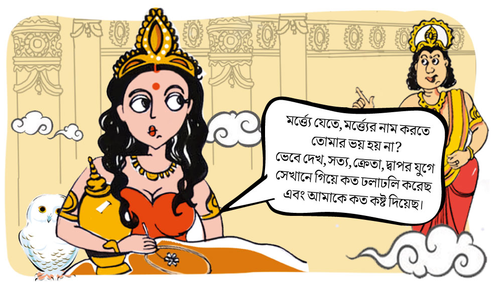 নারায়ণী আলুলায়িত কেশে কার্পেট বুনছিলেন, এবার বিরক্ত হয়ে বললেন, ‘পাঁচজনেই তোমাকে খারাপ কল্লে।’ এর পরের ডায়লগ আরও কঠিন— “মর্ত্ত্যে যেতে, মর্ত্ত্যের নাম করতে তোমার ভয় হয় না? ভেবে দেখ, সত্য, ক্রেতা, দ্বাপর যুগে সেখানে গিয়ে কত ঢলাঢলি করেছ এবং আমাকে কত কষ্ট দিয়েছ।”