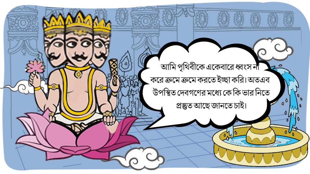 পিতামহ তখন বললেন, “আমি পৃথিবীকে একেবারে ধ্বংস না করে ক্রমে ক্রমে করতে ইচ্ছা করি। অতএব উপস্থিত দেবগণের মধ্যে কে কি ভার নিতে প্রস্তুত আছে জানতে চাই।’’