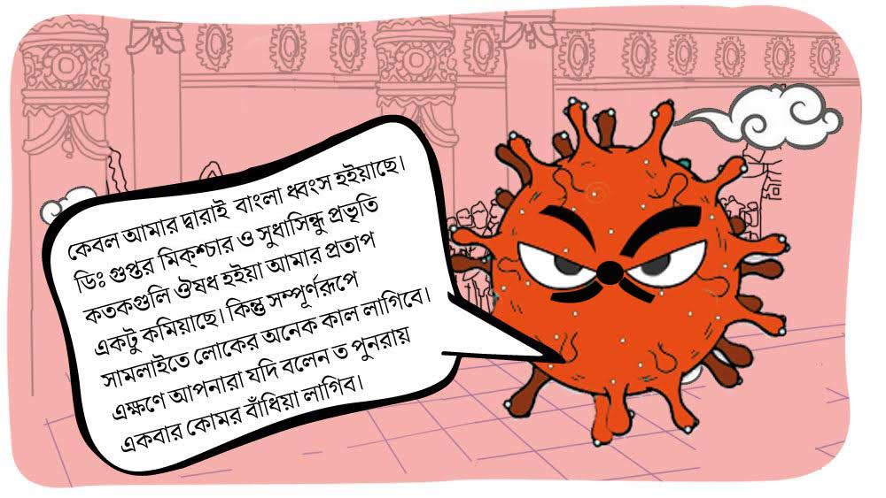 ‘‘তখন সংক্রামক রোগ গাত্রোত্থান করিয়া কহিলেন, কেবল আমার দ্বারাই বাংলা ধ্বংস হইয়াছে। আমি ১৮২৪ খৃষ্টাব্দে যশোহরের অন্তর্গত মহম্মদপুর নামক গ্রামে প্রথম আবির্ভূত হই। তারপর ১৮২৫/২৬ অব্দে যশোহর ও তৎসন্নিহিত অনেকগুলি স্থানের লোককে সংহার করিয়া ১৮৩২/৩৩ অব্দে নদীয়া জেলায় প্রবেশ করি এবং অনেকগুলি গ্রাম নষ্ট করিয়া ১৮৫৬ সালে উলাতে আসিয়া দেখা দিই। উক্ত নগর ধ্বংস করিয়া ১৮৫৭ অব্দে রাণাঘাটের নিকটস্থ অনেকগুলি গ্রাম নষ্ট করি। তৎপরে ১৮৫৯ অব্দে কাঁচড়াপাড়ায় উপস্থিত হই। কাঁচড়াপাড়া ধ্বংস করিয়া গঙ্গা পার হই এবং হুগলীর উত্তরপূর্বাংশ ও বারাসত ধ্বংস করিয়া তৎপর ১৮৫৯/৬০ অব্দে শান্তিপুরে শুভাগমন হয়। তথা হইতে ১৮৬৪ অব্দে কৃষ্ণনগরে যাই। ১৮৬৭ অব্দ পর্যন্ত থাকিয়া নগরের এক তৃতীয়াংশ লোক নষ্ট করিয়াছি। ডিঃ গুপ্তর মিক্শ্চার ও সুধাসিন্ধু প্রভৃতি কতকগুলি ঔষধ হইয়া আমার প্রতাপ একটু কমিয়াছে। কিন্তু সম্পূর্ণরূপে সামলাইতে লোকের অনেক কাল লাগিবে। এক্ষণে আপনারা যদি বলেন ত পুনরায় একবার কোমর বাঁধিয়া লাগিব।’’