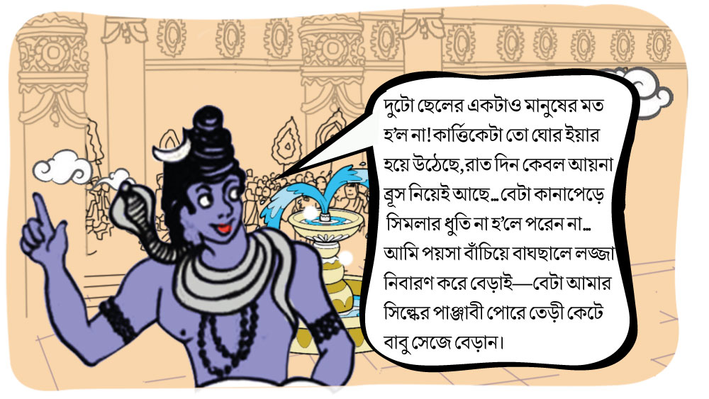 নরগণের শিবনিন্দার খবর আমরা শুনেছি, কিন্তু শিবের সন্তাননিন্দার খবর এই প্রথম পেলাম। নারায়ণের মুখে কার্তিক-গণেশের উল্লেখ শুনে শিব বেজায় তেতে উঠে বললেন, “দুটো ছেলের একটাও মানুষের মত হ’ল না! কার্ত্তিকেটা তো ঘোর ইয়ার হয়ে উঠেছে, রাত দিন কেবল আয়না ব্রূস নিয়েই আছে... বেটা কানাপেড়ে সিমলার ধুতি না হ’লে পরেন না... আমি পয়সা বাঁচিয়ে বাঘছালে লজ্জা নিবারণ করে বেড়াই— বেটা আমার সিল্কের পাঞ্জাবী পোরে তেড়ী কেটে বাবু সেজে বেড়ান।”