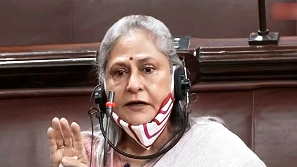 মুখাবরণ: কথা অস্পষ্ট হয়, তাই মাস্ক নামিয়ে বক্তব্য পেশ করছেন সাংসদ জয়া বচ্চন