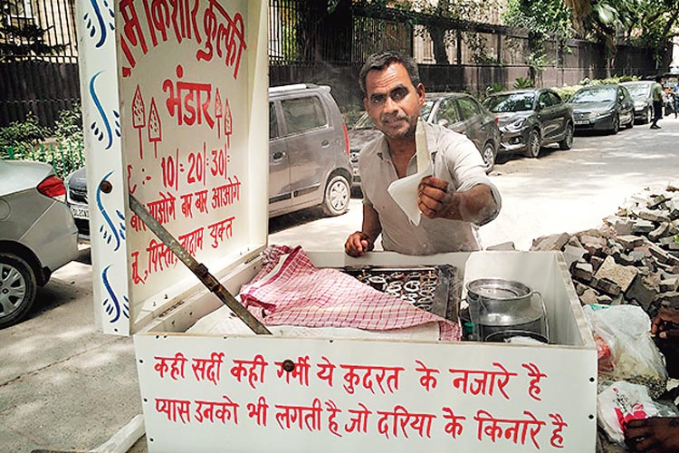 পাশেই রিজ়ার্ভ ব্যাঙ্ক। উল্টো দিকে আকাশবাণী ভবন। আশেপাশে নীতি আয়োগ, সংসদ ভবন, পরিবহণ ভবন, শ্রম-শক্তি ভবনের মতো সরকারি অফিস। এর মাঝখানেই, রিজ়ার্ভ ব্যাঙ্কের দেওয়ালের পাশে গত আঠারো বছর ধরে কুলফি বেচছেন দিল্লির বাসিন্দা রামকিশোর। গরম পড়লে, মধ্যাহ্নভোজনের শেষে একটু মধুরেণ সমাপয়েৎ-এর জন্য এ যেন মরুভূমিতে মরূদ্যান। কুলফির থেকেও বেশি বিখ্যাত রামকিশোরের কুলফির বাক্সের গায়ে লেখা শের-ও-শায়েরি। যা কিছু দিন অন্তরই বদলে যায়। কখনও ‘চাঁদ কি তারিফ সিতারোঁ সে পুছো, কুলফি কি তারিফ খানেওয়ালে সে পুছো’। এখন আবার চলছে ‘কভি সর্দি, কভি গর্মি, ইয়ে কুদরত কে নজারে হ্যায়, পিয়াস উসকো ভি লাগতে হ্যায় জো দরিয়া কে কিনারে হ্যায়’।