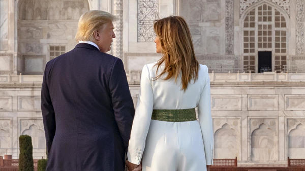 তাজের সামনে দৃষ্টি বিনিময়ে ট্রাম্প দম্পতি। ছবি: রয়টার্স।