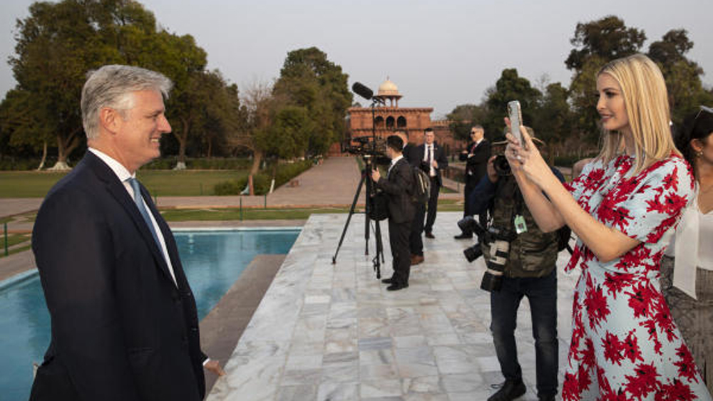 তাজকে পিছনে রেখে ট্রাম্প জামাতা। ক্যামেরায় কন্যা ইভাঙ্কা। ছবি: এপি।