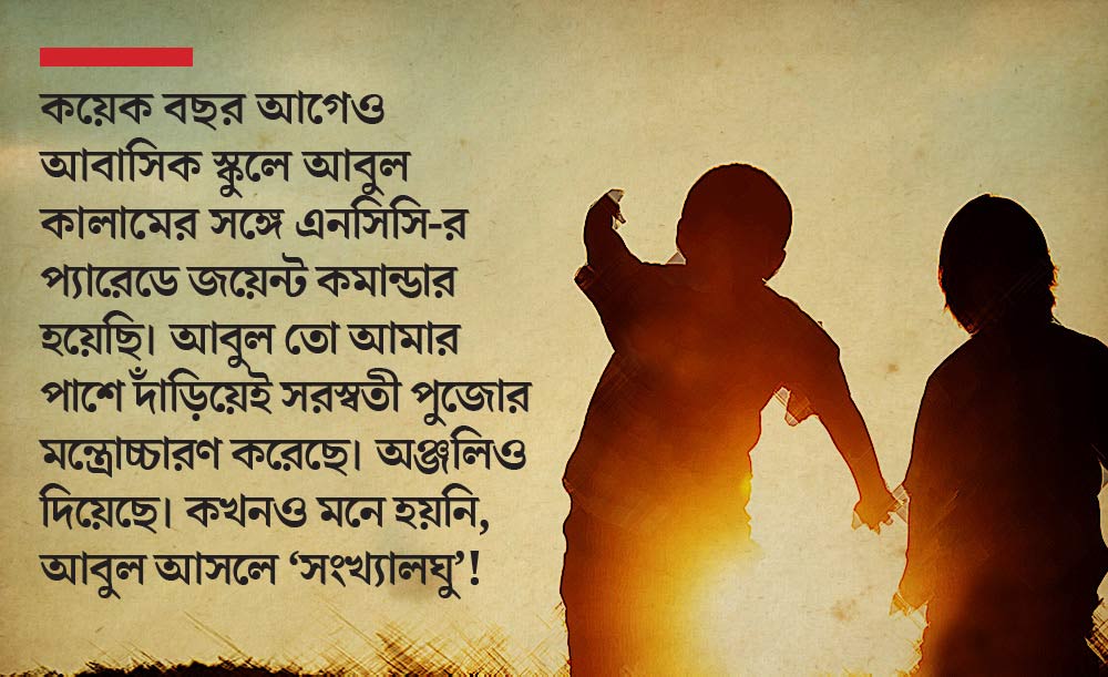 কিন্তু তখনও ঠিক ব্যাপারটা বুঝতে পারছিলাম না। হিন্দু! মুসলিম! সংখ্যাগুরু! সংখ্যালঘু! এ সব কী! আমি তো কয়েক বছর আগেও আবাসিক স্কুলে সহপাঠী আবুল কালামের সঙ্গে এনসিসি-র প্যারেডে জয়েন্ট কমান্ডার হয়েছি। আবুল তো আমার পাশে দাঁড়িয়েই সরস্বতী পুজোর মন্ত্রোচ্চারণ করেছে। অঞ্জলিও দিয়েছে। আমার তো কখনও মনে হয়নি, আবুল আসলে ‘সংখ্যালঘু’! এক ক্লাস জুনিয়র আসিফ ইকবালের বাড়ি থেকে আনা ইদের মহার্ঘ মেনু (মূলত সিমুইয়ের পায়েস) ওয়ার্ডেনের কড়া নজর এড়িয়ে ভাগাভাগি করে (কখনও কখনও কাড়াকাড়ি করেও) খেয়েছি। ওরাও তো আমার ওয়াড্রোবে লুকিয়ে রাখা বাড়ি থেকে আনা লোভনীয় খাবার (হস্টেলের পরিভাষায় ‘স্টক’) হামলে পড়ে খেয়েছে। কখনও তো মনে হয়নি, আবুল-আসিফ মুসলিম। অথবা মনে হয়নি, আমি হিন্দু।
