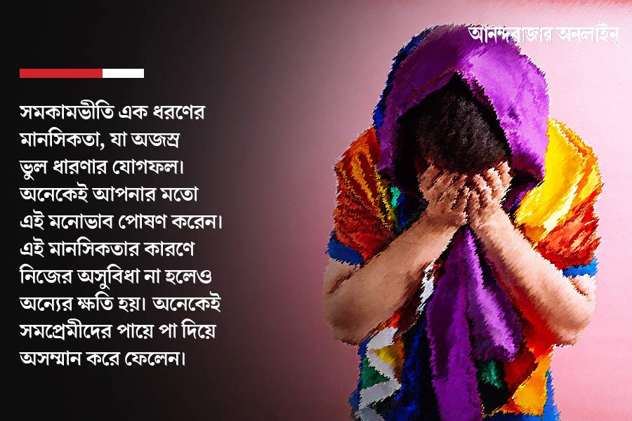 ‘গে’ বা ‘লেসবিয়ান’ শুনলেই কি আপনি আঁতকে ওঠেন? রেগে যান? কিংবা ‘হোমো’ বলে খিল্লি করেন? ঘাবড়াবেন না। আপনার সম্ভবত ‘সমকামভীতি’ আছে। সমকামভীতি মানে ওঁদের দেখলেই ‘বাবা গো-মা গো’ বলে দৌড় দেওয়া নয়। সে তো ভয়ের একটা প্রকাশ। অন্য রকমের প্রকাশও আছে। আগেভাগেই তেড়ে যাওয়ার মধ্যেও ‘এই বুঝি আক্রান্ত হলাম’-এর ভয় থাকে! বেড়ালের অ্যান্টিসিপেটরি রোঁয়া ফোলানের মতো।